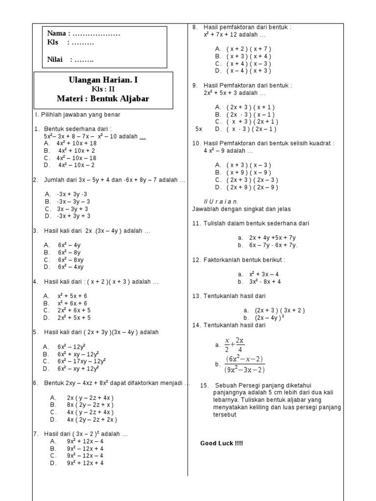 Soal Soal Aljabar Kelas 7 Download File Guru