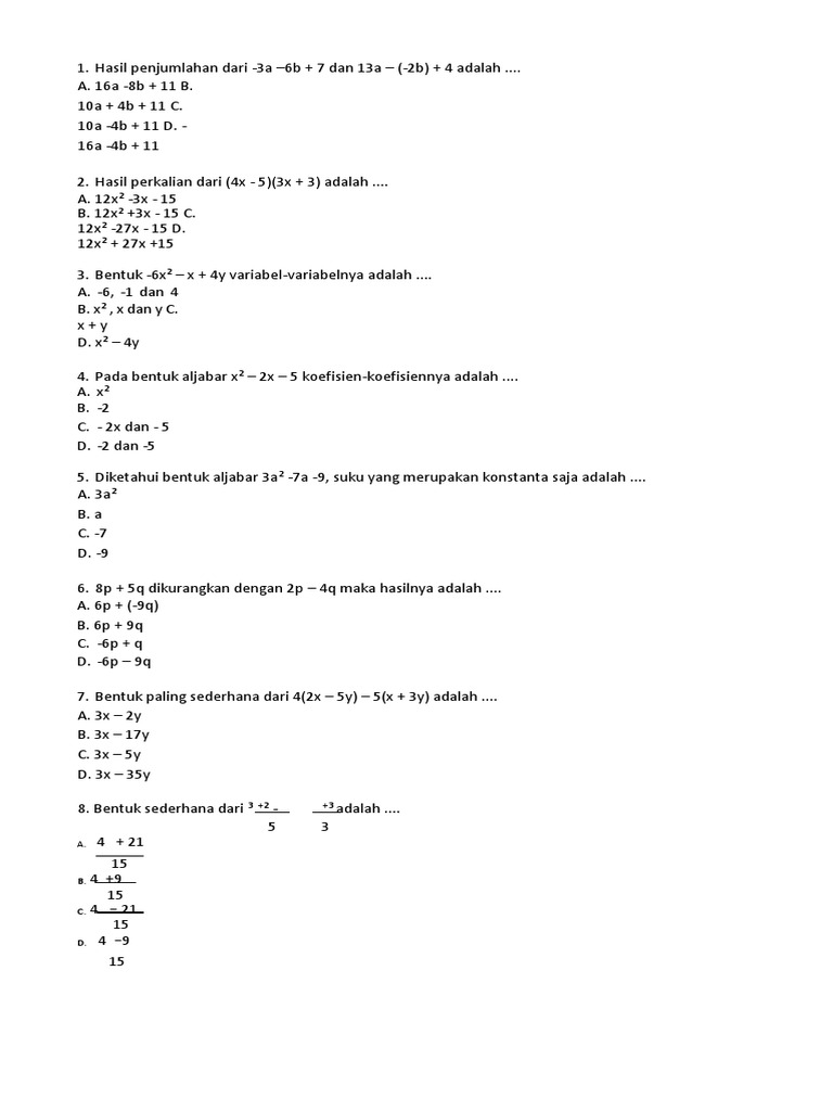 Soal Aljabar Kelas 7 Smp Dan Kunci Jawaban