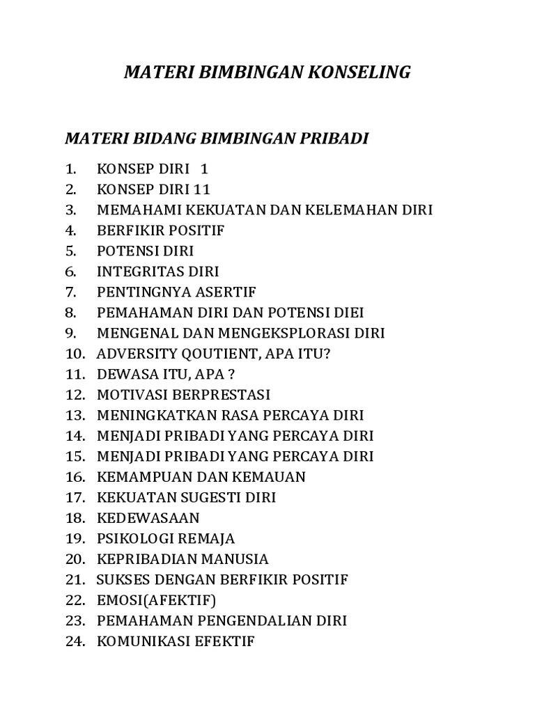 Bimbingan Konseling merupakan pemberian bantuan terhadap konseli yang diberikan seorang konselor guna membantu memecahkan masalah yang dialaminya serta interaksi antara konselor dengan konseli baik secara langsung maupun tidak langsung dalam rangka untuk membantu konseli agar dapat mengembangkan potensi dirinya atau pun memecahkan permasalahan yang. BIMBINGAN DAN KONSELING DALAM PROSES BELAJAR DAN PEMBELAJARAN. Sebuah materi yang menyajikan sekilas tentang membina keluarga juga merupakan persiapan awal yang harus diperoleh siswa sebelum menikah pasca lulus SMA.